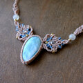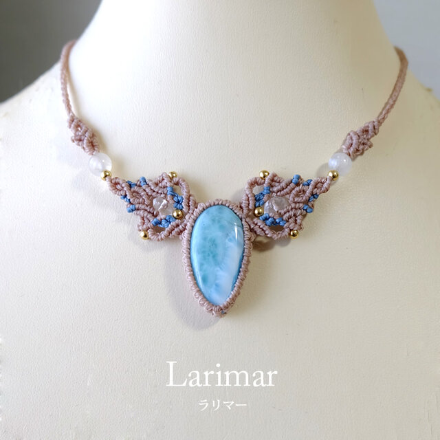 カリブ海の美しい宝石と呼ばれる魅力的なドミニカ共和国原産 ラリマーとサイドには小粒ながらも良質なタンザニア産ムーンストーンを合わせたマクラメ編みチョーカーネックレスです。