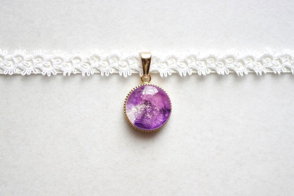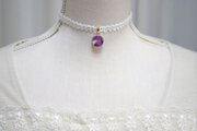 パールホワイトに二種類の紫色を置いた淑やかで上品なレジンを、サテンリボンにタティングレースで装飾を施したチョーカーに仕上げました。