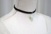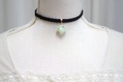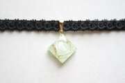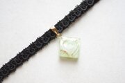 白とゴールドのマーブル模様の隙間から覗く柔らかなグリーンが爽やかで可愛いレジンを、ベルベットリボンにタティングレースで装飾を施したチョーカーに仕上げました。