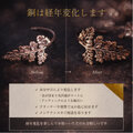初めはピンクゴールドに似た色味ですが、空気中の酸素・水分・人間の汗や皮脂にって経年変化し、使い込んだアンティークのような質感に変化していきます。変化が気になる場合は、アクセサリー用の磨き布、金属磨き液などを使えば、輝きが蘇ります。経年変化も味わいながらお楽しみいただければ何よりです。