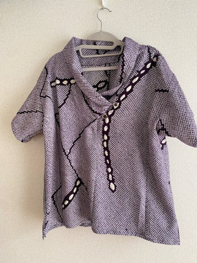 絞りの羽織をプルオーバーにリメイクしました。 襟元はドレープを生かしたデザインにし、裾は前を少し短くしました。 サイズ Lサイズ