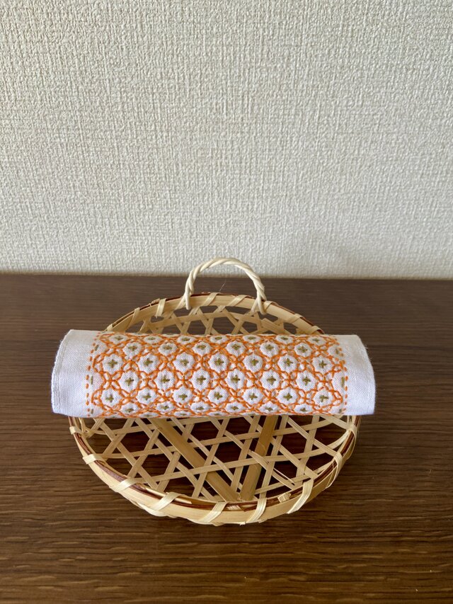 模様は一針一針丁寧に刺されています。 今回初めてのミニふきん。切りっぱなしでないのも嬉しいポイント。 ミニハンカチで使ったり、コ-スタ-でも使ってみたりと色々楽しみです。