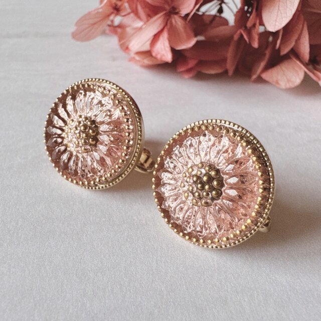 チェコガラスボタンのピアス/イヤリング ヴィンテージピンク