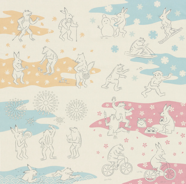 鳥獣戯画の動物たちが春夏秋冬のご挨拶で日本の四季を彩ります。