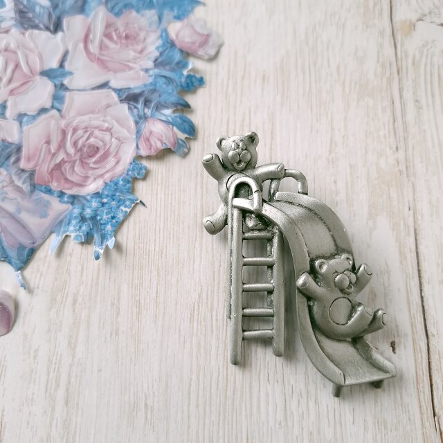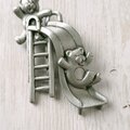 1935年にアメリカのロードアイランド州プロビデンスにて設立された「Jonette Jewelry Company」(通称J.J.、JJ)のシルバートーンのピューターの滑り台で遊んでいる2匹のこぐまがデザインされたヴィンテージブローチです。