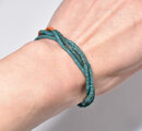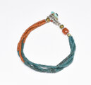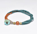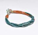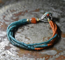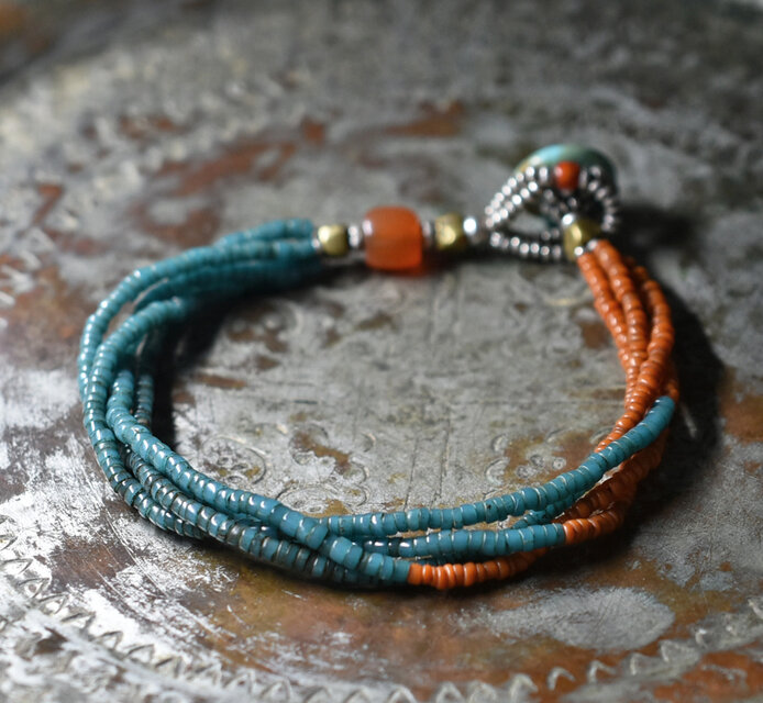 アンティークピーコックブルー&オレンジシードビーズ、ミゾーラムカーネリアンの4連ブレス(ターコイズ留め金)