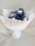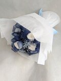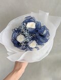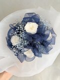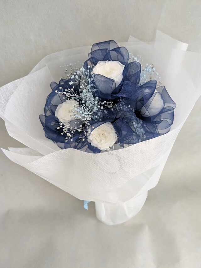 プリザーブドフラワー/白のミニ薔薇6輪とブルーオーガンジーリボンの花束