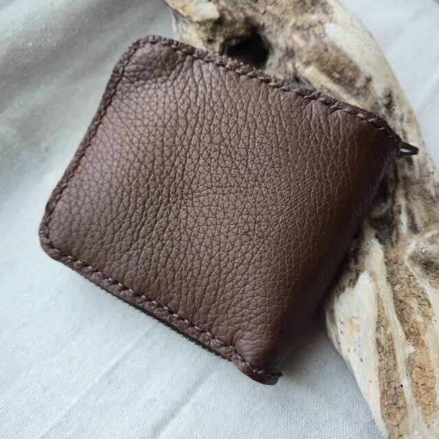 肌触りのいい鹿革を使用し、手縫いによるハンドメイドで自然の風合いを活かし制作した二つ折り財布です。