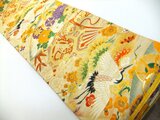 ■100年前の帯ですが大変状態が良く未使用品の帯地です。キナリ地に扇・飛鶴や菊、笹等の柄が込んだ古典文様です。