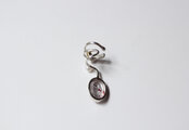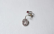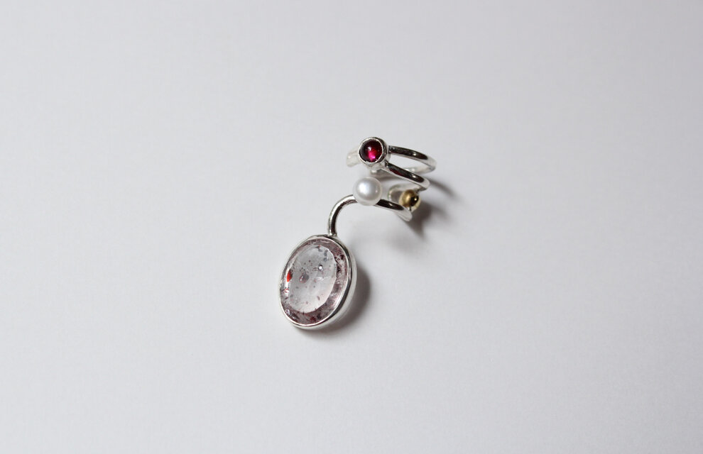 大ぶりのインクルージョンクォーツとロードライトガーネット、淡水パールをつけた独創的で個性的なイヤーカフです。