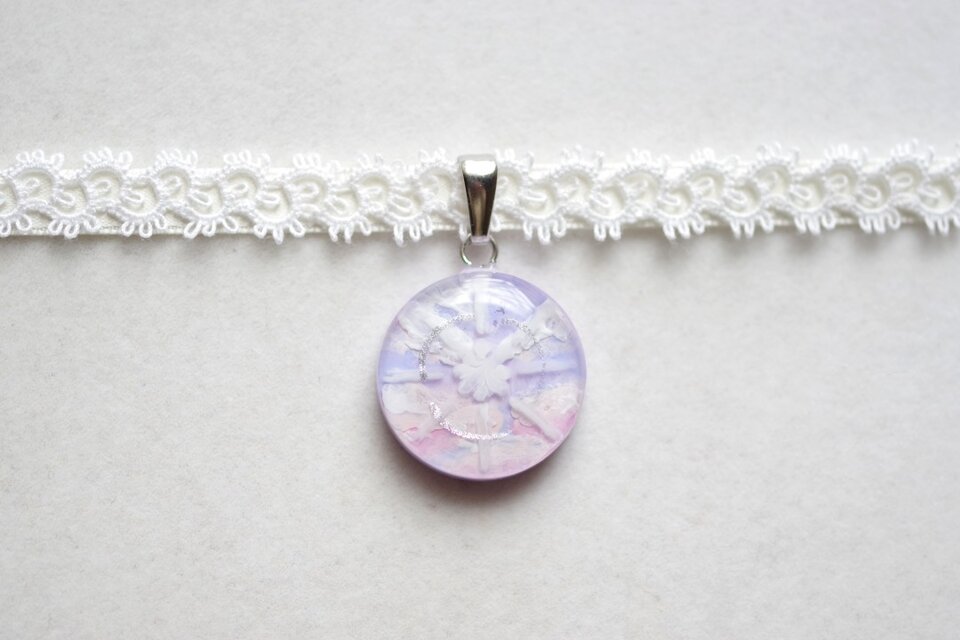 明け方の紫色の雲と昇る朝日の光線を描きこんだレジンを、サテンリボンにタティングレースで装飾を施したチョーカーに仕上げました。
