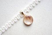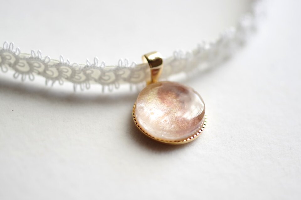 金色とブラウンの組み合わせがノスタルジックな、いつまでも見つめていられる上品なレジンを、サテンリボンにタティングレースで装飾を施したチョーカーに仕上げました。