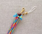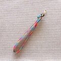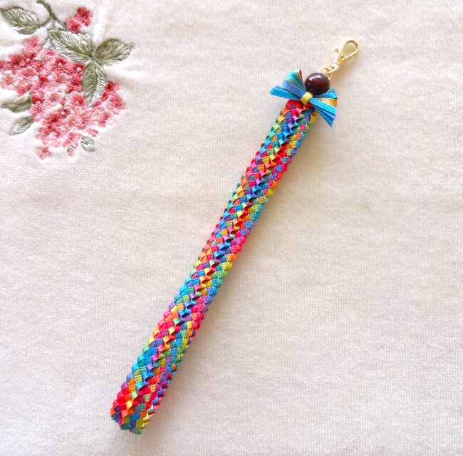 レインボーカラーのサテンリボンを編んで作りました、ハンドストラップです。
