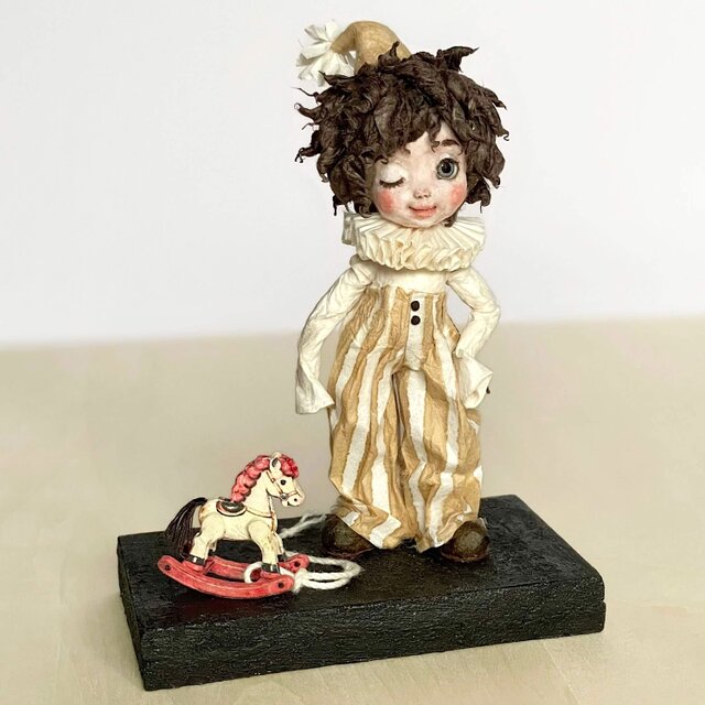 創作人形『全人類ピエロ時代』 — 小さな木馬と微笑むピエロ