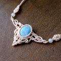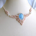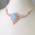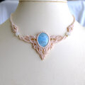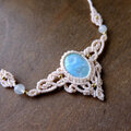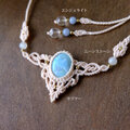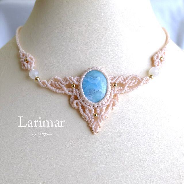 ライトブルーとホワイトが交じり合い水面のような優しい色合いが魅力的なラリマーが引き立つように明るめのコードで繊細に編み込み首元を彩る女性らしいマクラメ編みアクセサリーに仕上げました。