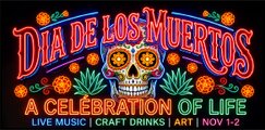 ネオンライト風のベクトルデザインで装飾された「Dia de los Muertos」イベントのサイン。
