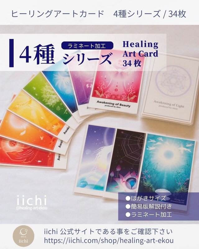 ヒーリングアートの4つのシリーズ34枚をラミネート加工した、はがきサイズのカードです。(ガイドブック付き)