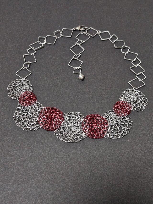 二色のアーティスティックワイヤーを使用し かぎ針で大小の円形モチーフを編んだものを 並べました。