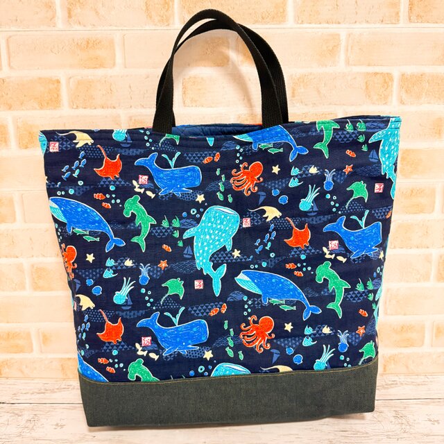 大きいレッスンバッグ(裏キルト) 【和柄・水族館★紺】
