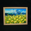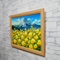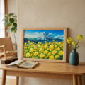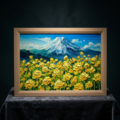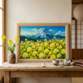 特に際立つのは、油彩の厚塗り技法(インパスト)が生む立体感です。一輪一輪が春の優しい風に揺れ、しっかりと大地に根ざし、空へと手を伸ばす息吹を感じさせます。背後にそびえる富士山は静謐な青と白のコントラストで描かれ、華やかな菜の花の存在感を見事に引き立てています。