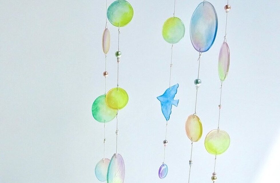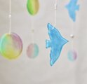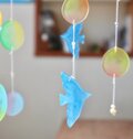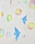 カラフルでつやつやのシャボン玉、2羽の青い鳥のモビールです。プラ板にひとつひとつ手描きで制作しました。
