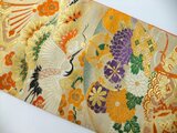 ■100年前の帯ですが大変状態が良く未使用品の帯地です。キナリ地に扇・飛鶴や菊、笹等の柄が込んだ古典文様です。