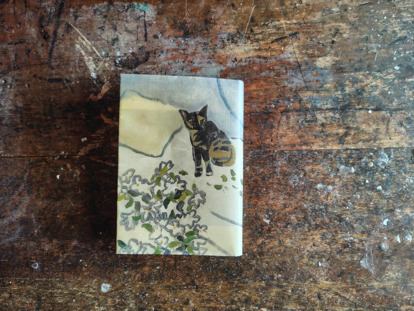 ロウ引きとは、熱で溶かしたロウを紙に染み込ませる加工方法です。紙に透明感と独特な味わいが出ます。使い込むたび入るシワや折り目の多様な風合いが一層の温かみを感じていただける作品です。また水に強く、しっとりとした手触りで本を優しく彩ります。