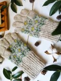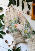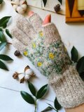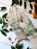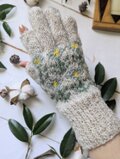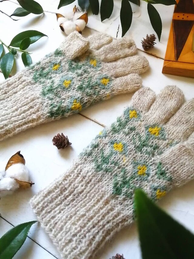 やわらかに積もった雪のような白に水色の花模様を編み込んだ、手編みのスマホ対応5本指手袋です。
