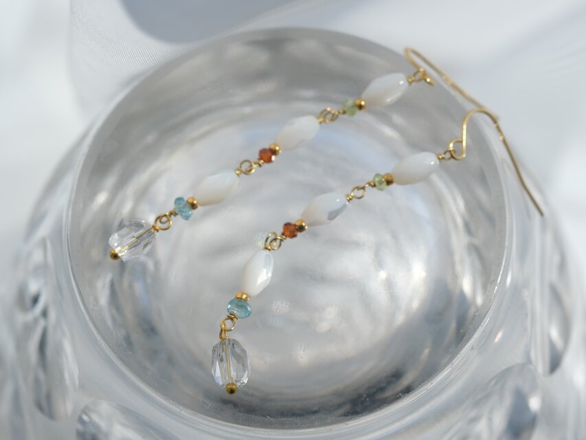 細やかなカットの入った煌めくマザーオブパール(シェル)、ブルーアパタイト、ペリドット、ヘソナイト(オレンジガーネット)を組み合わせた天然石ロングピアス