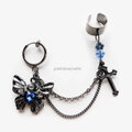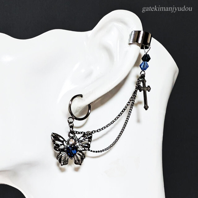青いストーンのついた蝶のフープイヤリングとビーズとクロスのついたイヤーカフを2連のチェーンで繋ぎました