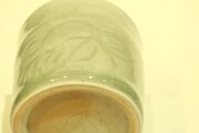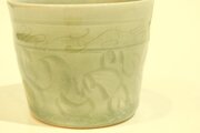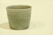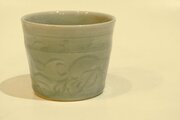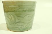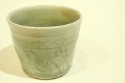 磁器土に唐草文様を全体的に彫り、そこに青磁釉が深くたまって 唐草文様を浮き出させていて独特な仕上がりになっています サイズ8.5cmx8.5cmx6.8cm