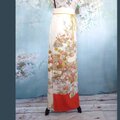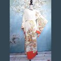 クリーム色のシルクのような滑らかな生地に、梅・桜・菊をはじめとした四季折々の花々が雅やかに舞い、遠景には富士山を思わせる山水が広がります。裾を彩る鮮烈な赤橙色が、全体を引き締めつつモダンな印象を与えてくれます。