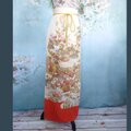 スカートは巻きスカート(ラップスカート)スタイルで、ゴールドの太めの飾り紐でお好みの位置で結べる仕様。裾の鮮やかな赤橙色の縁取りがアクセントになり、動くたびに美しい柄と色合いが覗きます。