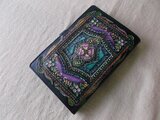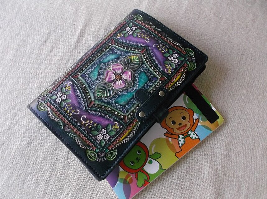 表装はタンニン鞣しの本革にクラフトを施し自家染色で染め上げたオンリーワンのデザイン。しっとりとした本革の質感が魅力です。内側はカードポケットも豊富に備えており、必要なものをスムーズに取り出すことができます。