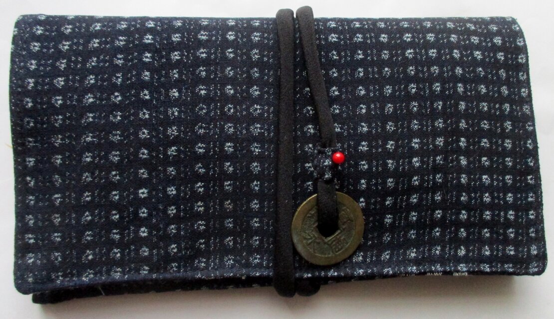 唐桟柄財布 写真より実際の方がいい感じですね、スマホ入れかな?ポーチ(巾着)も付いてて便利そう。和物はなんか落ち着いていいですね、縫製も丁寧で長く使えそうです。