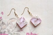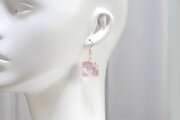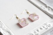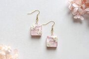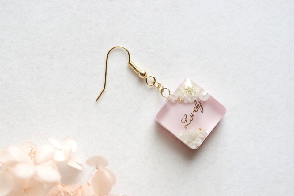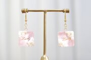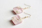優しいピンクの背景にお花やパールを配置し、中央に文字を置いたデザインが上品なピアス。(中央の文字は予告なく変更されることがあります)