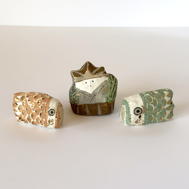 折り紙の兜をかぶり、菖蒲とちまきを持った子どもと、鯉のぼり2体の、計3体がセットとなります。