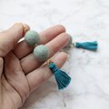 落ち着いた色合いのニュアンスカラーとブルーのタッセルの組み合わせは、ナチュラルなリネン素材のお洋服や、シンプルなニットにもよく映えます。