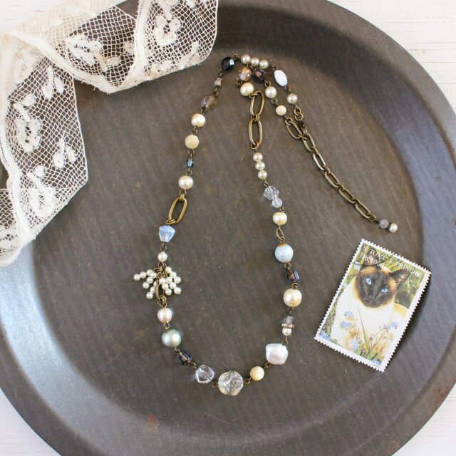 美しいものたちを、ひとつひとつ丁寧につなぎ合わせて完成させた、ヴィンテージ感を押し出した、ショートネックレスです。
