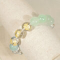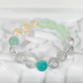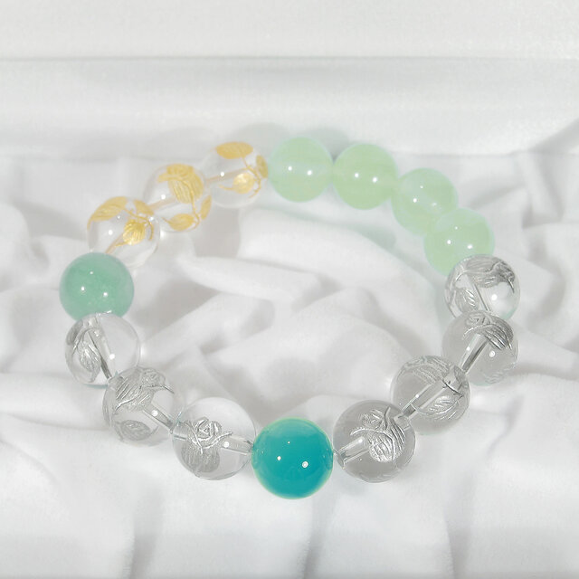 光沢感の綺麗なシーブルーカルセドニーとブレナイト、ゴールド色とシルバー色の薔薇のつぼみが彫られた透明感の美しい水晶のブレスレットです。