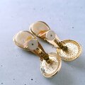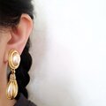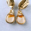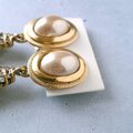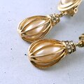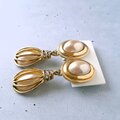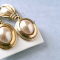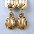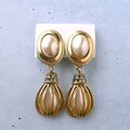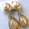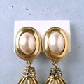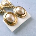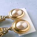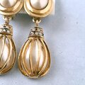 フェイクパールのオーバルにクリアラインストーンがあしらわれたケージに入ったティアドロップのフェイクパールが揺れるデザインの大ぶりなヴィンテージイヤリングです。