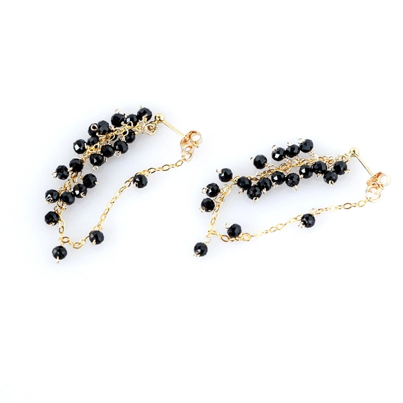 揺れるブラックスピネルの房チェーンピアス 14KGF シックエレガン