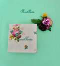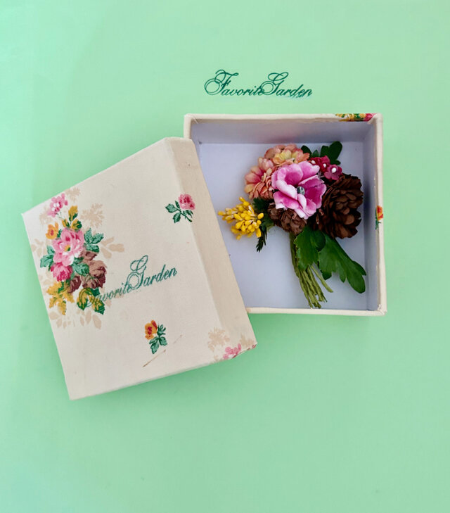 フランスの可愛いヴィンテージの布を貼って作ったBOXにコサージュをセット致しました。