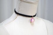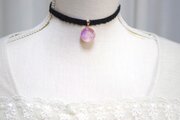 黄昏の空をイメージした紫とピンクを背景に、小さく可憐なお花を三輪添わせたレジンを、ベルベットリボンにタティングレースで装飾を施したチョーカーに仕上げました。