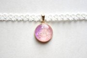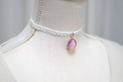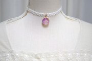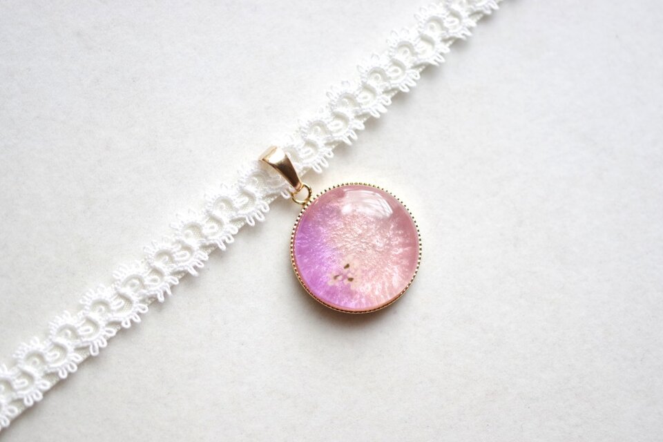 黄昏の空をイメージした紫とピンクを背景に、小さく可憐なお花を三輪添わせたレジンを、サテンリボンにタティングレースで装飾を施したチョーカーに仕上げました。