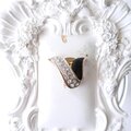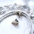 ブラックエナメルとラインストーンを組み合わせた、立体的なV字フォルムが特徴です。