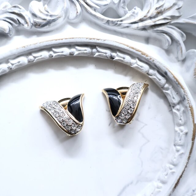 【フランス買付】ヴィンテージ ブラックエナメル × ラインストーン イヤリング*Vモチーフ 1980s【1万円以上で送料無料】