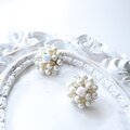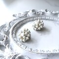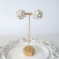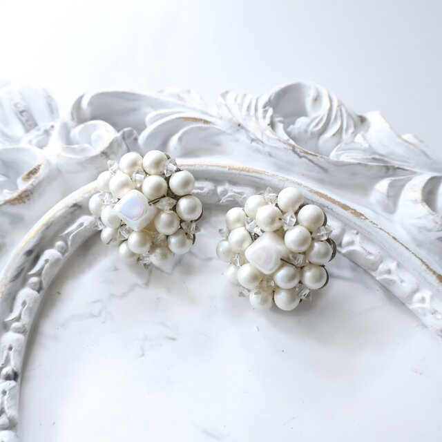 小粒のパールが集まった華やかなフォルムは、シンプルなニットやシャツスタイルにもよく映えます。中央のオーロラスクエアビーズが光を受けてやわらかく輝き、ヴィンテージらしい気品ある耳元を演出します。