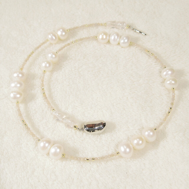 10mm本真珠(淡水パール)とムーンストーン、SV925のネックレス(51cm、天然石、6月の誕生石、ホワイト、ピンク)