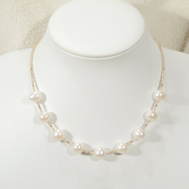 10mm本真珠(淡水パール)とムーンストーン、SV925のネックレス(42.5cm、天然石、6月の誕生石、ホワイト、ピンク)